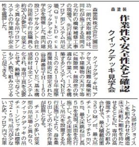 2025.10.30 活動報告 クイックデッキ見学会 この度現在施工する橋梁補修工事にて 先行床施工式フロア型システム吊り足場「QuikDeck]の見学会を開催しました。 その内容が建設新聞に掲載されましたのでご紹介いたします。